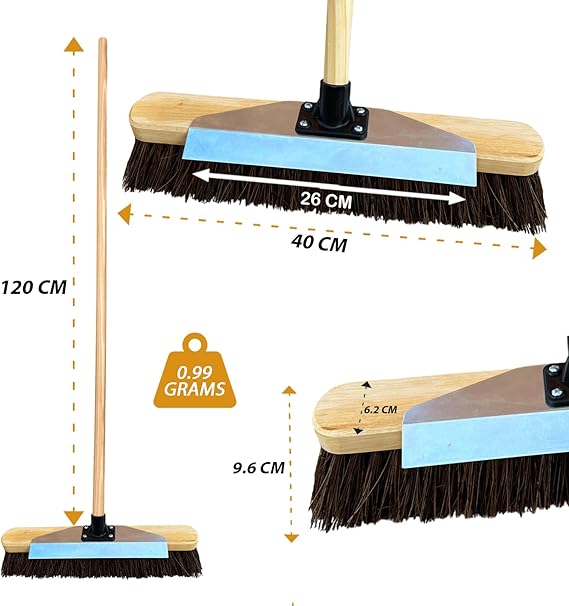[ Pack Includes ] 1x 16 inches wide Broom made of Hard Bassine Material with 120 cm Long Wooden Handle for Easy Sweeping. This comes as unassembled broom head and handle. You can easily assemble it by pushing handle into the plastic socket on the broom head.