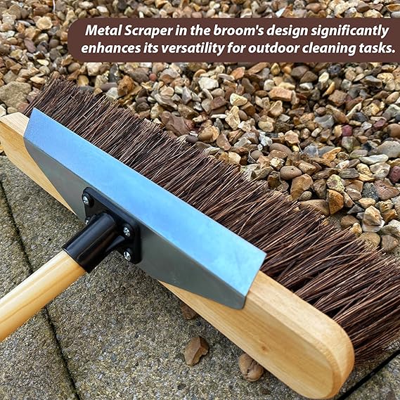 [ Metal Scraper ] The inclusion of a metal scraper in the broom’s design significantly enhances its versatility for outdoor cleaning tasks. This feature allows for the efficient removal of stubborn or stuck-on debris from surfaces like patios or walkways, providing added convenience and effectiveness in maintaining outdoor areas.