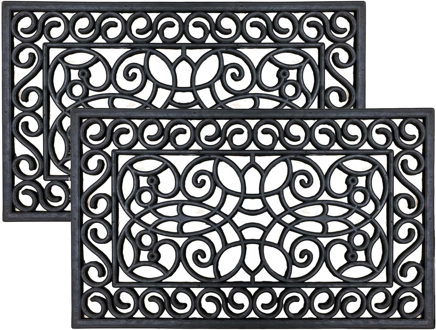 Easy to Clean: Pack of 2 Black Decorative Design Large Rubber Door Mat, featuring a size of 45 x 75 cm. Apart from its visually appealing design, these outside door mat boast easy maintenance. Cleaning is a straightforward process, as you can simply rinse them with a hose, shake off accumulated dirt, or use a brush to remove debris.
